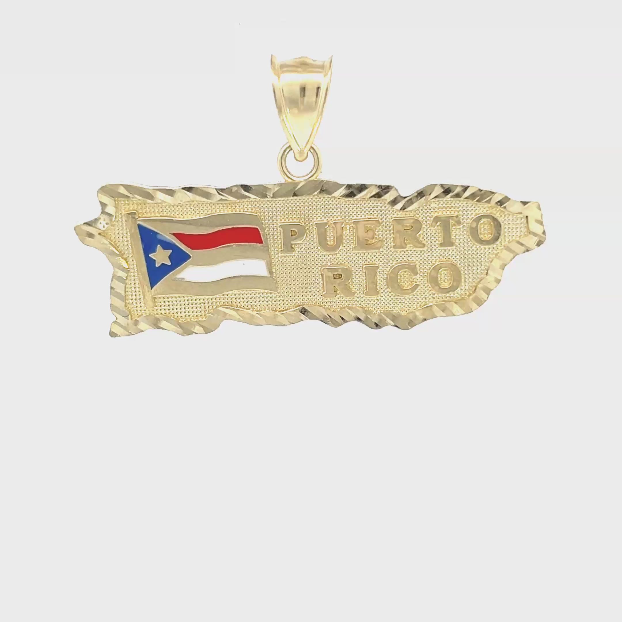 10k yellow gold Puerto Rico flag pendant with enamel on flag and diamond cut borders with textured background